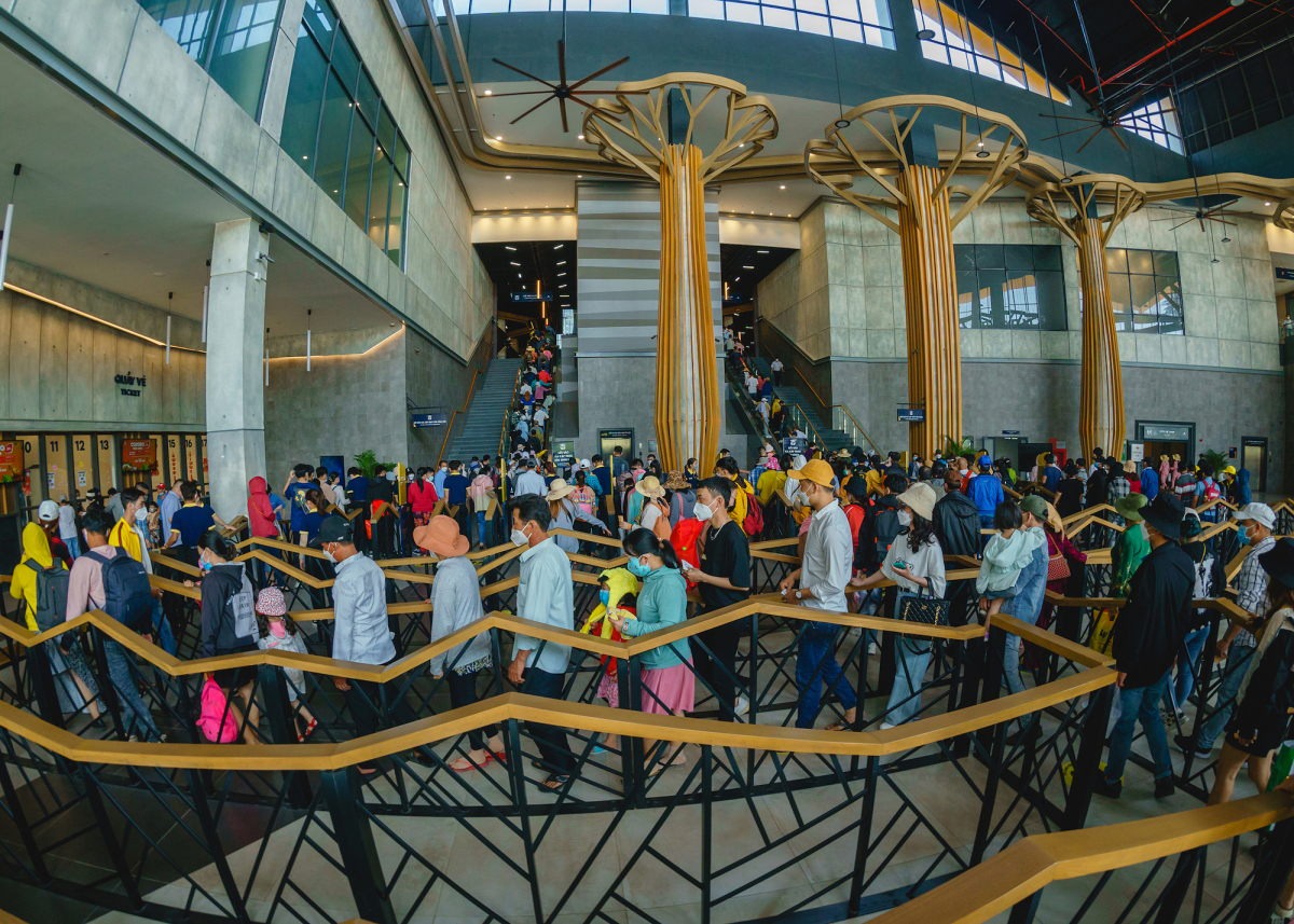 Trong đó Tây Ninh đứng đầu cả nước với 595.000 lượt khách trong 5 ngày từ 1 đến 5/2 (mùng 1 đến mùng 5 Tết). Cáp treo núi Bà Đen đón gần 350.000 lượt khách tham quan, ngoài ra có thêm khoảng 100.000 du khách tới đây leo bộ. Trên ảnh là cảnh xếp hàng kín lối đi khu vực ga cáp treo. Ảnh: Phương Thảo